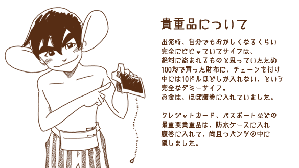 | 電子辞書 | あると心強い。わからない単語などすぐ検索、登録できる。海外では珍しいらしく、インドなどで『売ってくれ!!』と、声をかけられた。これも盗まれやすいので注意。 |