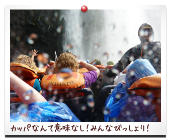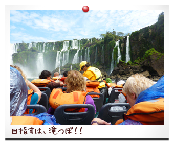 アルゼンチン側イグアスの滝で参加したボートで滝つぼ 突撃ツアー。ツアーメンバーは、荷物を防水バックに 詰め込みカッパを着込んでいる。 うちはひとり、海パン一丁になり、救命胴衣を着込む。 ボートが出発!まずは、急流を旋回し、滝の様子を伺う。 そして、突撃!! ものすごい水流!!こんなのカッパなんて なんの役にもたたないだろっ!! 海パンになって正解だった!! 一度離脱し、体勢を整えてからの再度の突撃!! みんなびしょびしょになりながら、きゃあきゃあ!! とっても楽しいツアーだった!!
