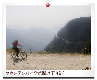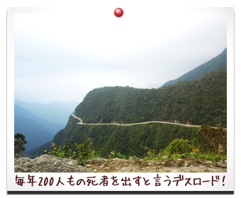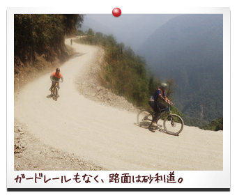 標高4700mから標高1000mほどまで、高低差3000mを自転車で 一気に駆け下りる 『ダウンロードヒルツアー』 年間200にんもの死者がでると言われるデスロードを自転車で駆け降りる。それだけで、ワクワク、スリルがたまらない! 道は、急な坂が続き、砂利道の悪路がつづく。 うちが参加したツアーでも、メンバーの女の子が砂利道で 転倒し、擦り傷大泣き。ベテランのガイドのにいちゃんすらも 転倒したらしく、次の日、腕を吊っていた・・・。 2010年にも、このツアーに参加した 日本人女性が死亡したらしい。 参加は自己責任で、自分の技量に過信はないように・・・。 それでも、日本では味わえない、スリル一杯のツアーでした! |