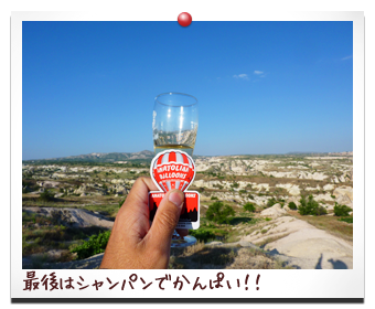 世界の絶景ランキングでもランクインしていた カッパドキアの気球が、こちらでもランクイン! やっぱりそれほどすごかったんだよなぁ! 上空から眺めるカッパドキアの景色は、とても神秘的で 同時に上がる数々の気球がその景色にさらに花を添える 約一時間ほどの空中散歩のあとは、みんなで シャンパンで乾杯!