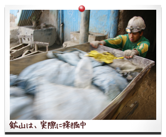 世界一高所にある都市、ボリビア ポトシ。 ここでは、実際に採掘中の鉱山を見学できるツアーがある。 まずは鉱山近くで、鉱夫さんへのお土産である ジュースとコカの葉(鉱山は劣悪な環境で鉱夫さんたちは、 コカの葉をほっぺに貯め、それを噛み、神経を麻痺させながら働いている。)それと爆破体験用のダイナマイトを買う。 ときどきすれ違う鉱夫さんにお土産を渡しながら奥へ奥へと 進む。鉱山内は、チリが充満し、これを吸い込みながら歩いているのかと思うと、ちょっと怖くなる。