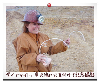 見学終了後、さっき買ったダイナマイトを 爆破できるようにして、導火線に火をつけた状態で記念撮影 爆発したダイナマイトの威力には、ただただびっくり!!!