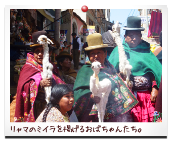 街のいたるところに、リャマのミイラが吊るされた状態で 売られている。毛のあるものは、まだかわいい?が、 毛の無いものまである。なんだかちょっと不気味。 だけど、ここまで町じゅうで売られていると、 普通に思えてくるから不思議だ・・・・。 ホステルを出て、買い物に出かけようとすると、 なんだか騒がしい。 よく見てみると、人だかりができている。 カラフルな衣装を身にまとったインディヘナの おばちゃんたちが、それぞれリャマのミイラをかかえ そしてその前には前足後ろ足が縛られた ちょっと大きめなミイラ(ビクーニャ?)