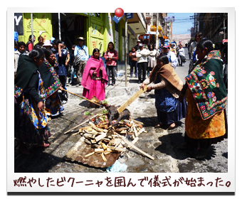 大きめなミイラ(ビクーニャ?)に火がつけられた。 インディヘナのおばちゃんたちがそれを囲み お酒をふり掛けながらまわっている。 なにかのおまじないかしら?