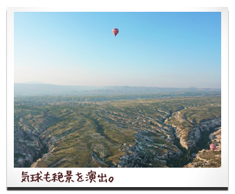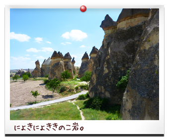 日本では、見たこともないような不思議な光景が 広がるカッパドキア。 地上から眺めててもすごいけど、気球に乗って 上空から眺めるともっとすごい!! にょきにょきにょきにょきあちこちから 不思議な形の岩が生えてて なおかつ、そこで人が生活している。 |