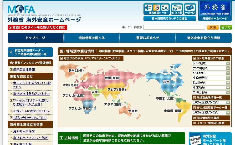 渡航予定の国はここでチェック。けど、犯罪暦など羅列してあるため しょっちゅう、こんな凶悪事件が起こってるの!?と 不安になったりもする。知らぬが仏ってことわざもあるし・・・ ほどほどに・・・ |